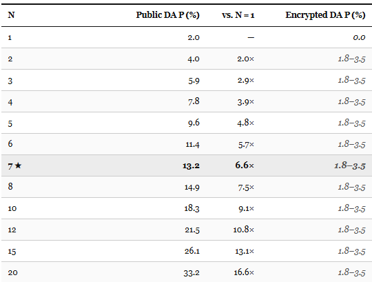 The 1.8-3.5% floor for encrypted DA that we model is illustrative. It would depend on relay-level leakage (if MEV-Boost or equivalent infrastructure sees plaintext before encryption, a possibility in TEE-based schemes), timing attacks (the existence and size of a ciphertext can leak information even if content is hidden), and statistical inference (high-frequency traders can sometimes infer transaction content from size + timing patterns on known protocols).