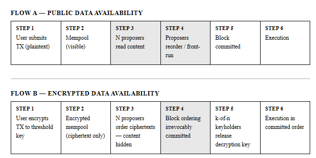 Under encrypted DA: The proposer sees 0x9f3a...c2b1, a ciphertext. They have no idea if it’s a swap, transfer or a contract deployment. They cannot construct a sandwich because they don’t know the token pair, direction, size, or anything else meaningful. The ordering commitment happens before decryption. Once the block order is irrevocably finalised on-chain, the decryption key is released and transactions execute in that committed order. At that point there is nothing to front-run; the ordering is already done. However, efficiently constructing a block becomes significantly more difficult (if not impossible) since the proposer has no clue about how much gas a specific transaction will consume (and if he knows, then he will also have an idea of what type of transaction is committed).